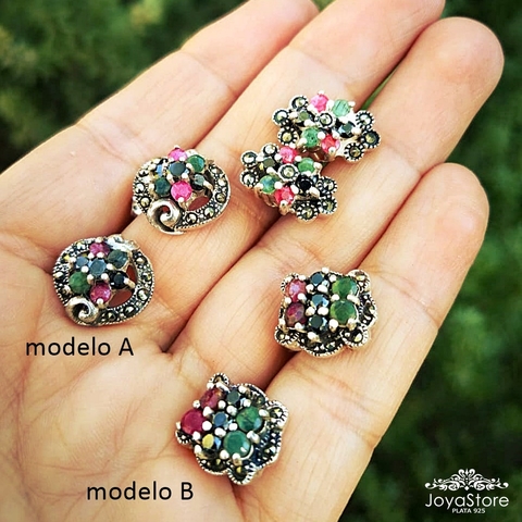Aros de Plata 925 con Aplique de Piedra Raiz de Esmeralda, Raiz de Rubi y Marquesitas